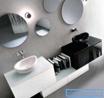 Обичайната версия на стената, когато гвоздеят е запушена и на нея висяща отразяваща чаша с определена форма, няма да я разгледаме, защото е по-подходяща за зала или хол, интересуваме се от банята.