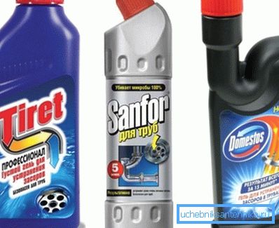 | Специални инструменти | В търговията има голям брой специални съединения, с помощта на които е възможно да се борим с отломки от канализационната мрежа. Изборът на този или онзи вариант трябва да се извърши разумно - по-добре е да се консултирате с компетентния човек или да уважавате отговорите за този или този вариант в мрежата в Интернет, понякога ценните съвети могат да дадат и продавача в магазина |