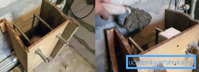 - След това бетоновият разтвор се приготвя и поставя в кофража. Уверете се, че винтовете и отворите за изтичане не се движат. Те могат временно да се поддържат с парчета полистиролова пяна.