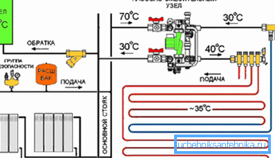 Останалата част не винаги може да поддържа такава занижена температура, следователно в схемата е инсталиран байпас с вграден трипътен вентил. Полагане тръби изработени спирала и змия, но най-оптималното разположение, което могат да видят в горната фигура вляво.