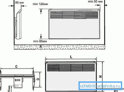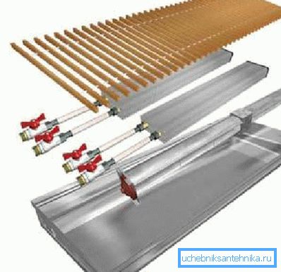 Нагревателят с радиатора се намира в долната част на устройството. При отопление нагревателят дава топлина на радиатора, при проектирането на които се осигуряват въздушни канали, преминавайки през въздуха, като се затопля и излиза през декоративната скара, разположена по-горе.