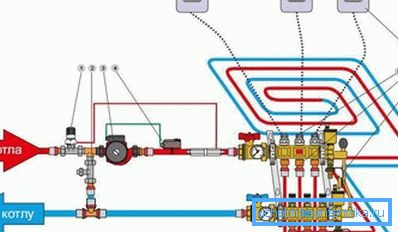 За да приложите такова отделяне, ще ви е необходима помпа за смесване на помпа, която обикновено се състои от байпас. В нея се вмъква трипътен вентил, който регулира горещия поток. Когато течността в топлата тръба за пода събира желаната температура, вентилът от захранващата тръба не я насочва към топъл под, а просто я хвърля обратно в тръбата, докато термостатът не инструктира загряването на веригата.