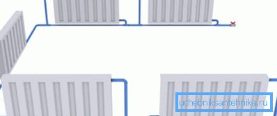 - Водопроводът минава през къщата и завършва на последния радиатор. В същото време към него са свързани само входните съединения на всички радиатори.