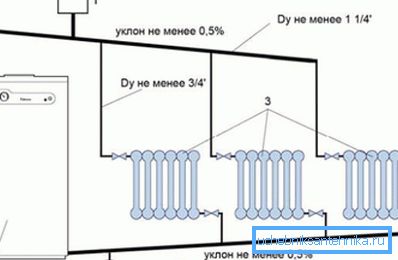 В този случай цената на отоплителната система е минимална, тъй като няма значителни разходи (с изключение на котела). Но съществен недостатък на тази схема е слабото естествено налягане, така че скоростта на охлаждащата течност е малка.