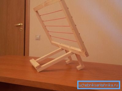- За работа ще ви трябват две дъски, чиято дължина е с 10 см по-голяма от височината на радиатора, няколко по-малки тръби и няколко големи тръби за напречните гребени, както и дървени дюбели, От инструмента се нуждаете от отвертка с набор от свредла за дърво, така че ясно да разберете какъв дизайн трябва да бъде, ние го показахме в завършен вид на снимката по-долу.