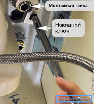 - Свързваме маркучите с другите краища към тръбите, като използваме гайките. Ние ги вдигаме с ръце до спиране, след това затегнете ключа до пода на завой, максимум - до 270 ?.
