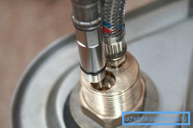 - След като фиксирате смесителя, можете да отидете на водната връзка. На този етап просто не бъркайте цветовете и свържете гъвкавата тръба със синята марка със студена вода и от червено до горещо. Не се ревнувайте, когато затягате гайките;