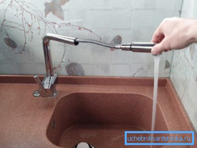 Освен това, гъвкавият маркуч е много удобен, ако трябва да напълните басейна или кофата с вода - няма да има пръски. В този случай маркучът не виси постоянно, когато няма нужда от него, той просто се крие в пространството под мивката, поради което такива черупки се наричат "с плъзгаща се поличка".