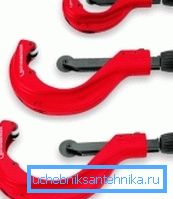 Също така се погрижете за режещия инструмент, защото по време на инсталацията често ще трябва да отрежете тръбите, като постигнете правилния размер. Най-добре е да използвате специални инструменти, които след рязане образуват лицева страна на крайната страна на продукта (цената на този нож е малка и можете свободно да го закупите в строителен магазин).
