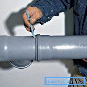 - Гладката част на тръбата трябва да бъде натиснат в гнездото на друга тръба, съединител, кран или адаптер към спирачката, след което да се маркира мястото, където ще бъде разположена разрезът.