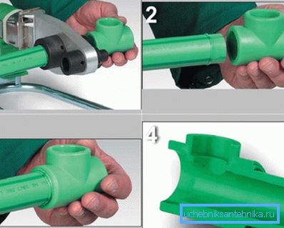 За да бъде равномерно заваръчното съединение, необходимо е да държите тръбата и фитинга върху горещата дюза на спойката за определен период от време, което можете да видите в таблицата отгоре. Така че най-често срещаният диаметър PPR (20 мм) се загрява с спояващо желязо при температура 270-280 ° С в продължение на 5-6 секунди. След това и двата елемента рязко се освобождават от дюзата, те се съединяват и задържат за 2-3 секунди (може да се направи повече), за да се фиксира спойката.