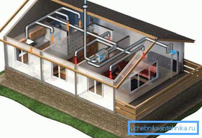 По принцип каналите от различни помещения се вкарват във вентилационните отвори и се свързват помежду си на тавана с помощта на колектор, от който излиза тръбопроводът през покрива. Тръбопроводите трябва да се извършват в строго съответствие със схемата.