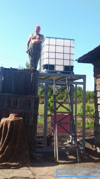 - Ако източникът на вода във вилата е кладенец без помпа, тогава е необходимо да носите вода с кофи. Съответно отзад към душа прикрепяме достатъчно широка и здрава стълба и ние избираме резервоара с такова гърло, така че да може да се излива от кофата бързо и без загуба.