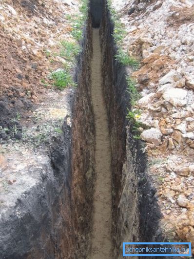 Обърнете внимание! Когато се напълва, багажникът трябва да бъде хвърлен в ъгъла на изкопа, като се избягват камъни, големи буци и отломки, така че да не се повреди тръбата.