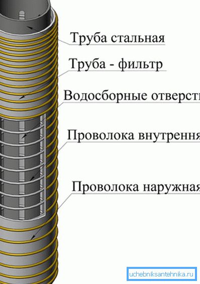 - Гнездото не може да се захранва с вода без добра филтърна колона. Разположен е в долната част на багажника и е тръба с отвори с перфорация и решетка за механично филтриране на водата.