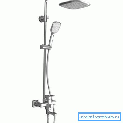 | Стойка | Това е комплект с горен душ, който в допълнение към помпата за напояване включва смесител (със или без канал) и самата стойка. Тази система може допълнително да включва ръчен душ. Когато монтирате багажника, миксерът и лентата остават видими, което прави интериора малко по-малко естетичен. Въпреки това, в случай на повреда, багажникът е лесен за ремонт, без да се налага да се разваля покритието на стените и тавана. |