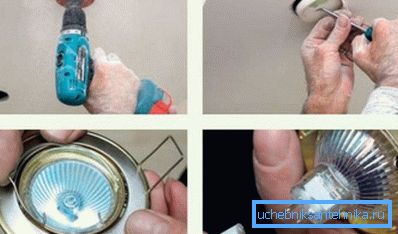 - Поставяме отвертка или пробиваме специална глава и пробиваме кръгла дупка, подобна на диаметъра на прожекторите.