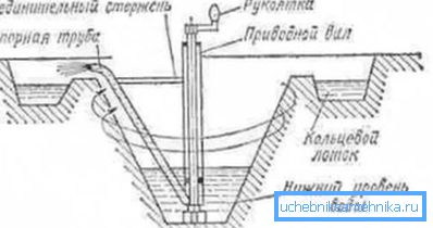- Към вертикалния вал е прикрепена тръба, която е здраво свързана с нея чрез свързващ прът;