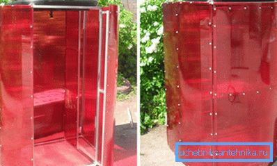 Най-често това е лесна сгъваема рамка с конвенционална завеса за душ. Предимството на този тип структура е тяхната мобилност. Той може да бъде събран или разглобен в рамките на няколко часа, плюс това не тежи много, лесно се пренася през територията на обекта и се крие в къщата за зимата.